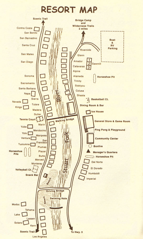 Nestled in the trees along one mile of the river are fifty private, rustic camping cabins. Each cabin has a sleeping veranda; one or two bedrooms; bathroom(s) with shower; a kitchen complete with stove, oven, refridgerator, utensils, dishes, pans, and an outside barbecue and picnic table. Cabins have electricity but no heat.